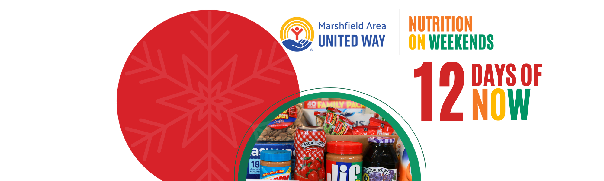 From Dec. 1–12, add one item each day from the Nutrition On Weekends (NOW) 12 days of NOW shopping list to your donation box, or put $12 each day into your envelope to sponsor a child Learn more here Dark Red Solid Dark Green