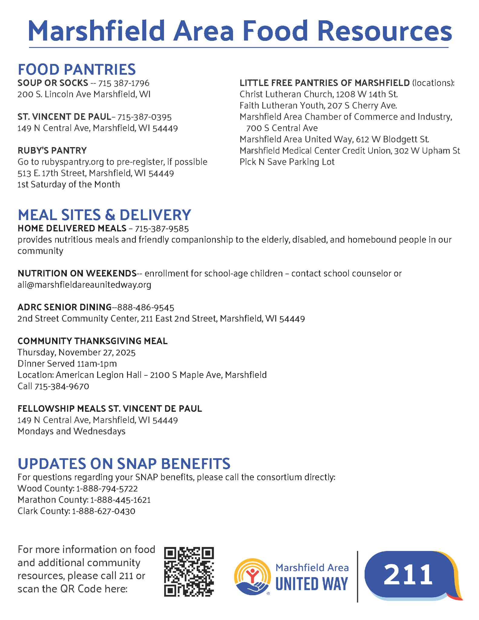 We are here to help! Our office has been getting a significant number of questions about help with food needs. Here is some information for the Marshfield area. If you are looking for additional information, please call 211 or our office at 715-507-5005.