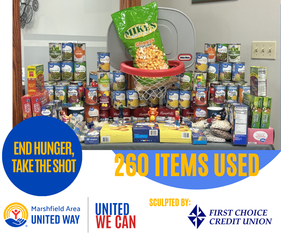 Businesses and organizations will build sculptures using non-perishable food items (not expired or within 3 months of expiration). Sculptures should be 95% made from pantry items, though structural supports can be used to keep the sculpture sound. Labels on cans and boxes cannot be damaged or removed. Once completed, teams will submit their sculpture photos to the Marshfield Area United Way, where they will be featured in a Facebook voting contest. The public will vote for their favorites using a thumbs up (1 point) or a ❤️ heart (2 points).